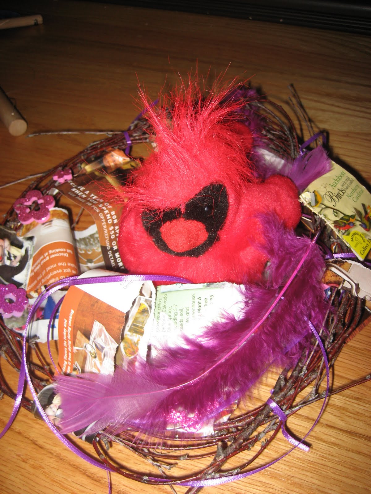 Next, we got to work on some whimsical crafts. We found two bird nests in our new backyard, one occupied one not, which led to conversations about how and why birds build nests. To the occupied group Jessie declared, “I no like those Birdies!” When I asked why she replied, “They fly away when I talk loud.” The unoccupied nest was even more problematic and we called “Here birdie birdie! Come back your house!” for most of an afternoon. Sweets seemed really inspired by the fact that some birds use all sorts of yarn, feathers and other fuzzy scraps to make a nest and so she decided to make one for her little red birdie friend.